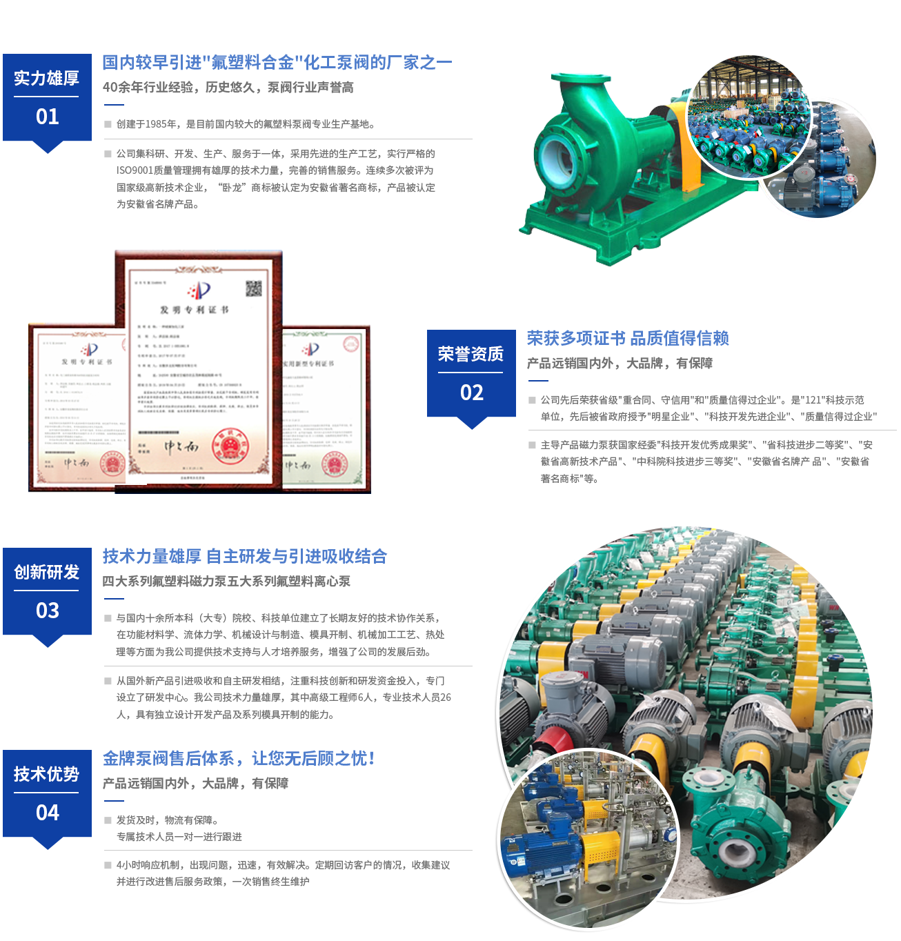 ??安徽臥龍泵閥股份有限公司前身涇縣氟塑料制品廠創(chuàng)建于1985年,是國內(nèi)較早引進(jìn)中科院上海有機(jī)化學(xué)研究所專利材料——"氟塑料合金",并以此耐腐蝕材料專業(yè)生產(chǎn)制造化工泵、閥、襯氟管道等產(chǎn)品的企業(yè)。公司經(jīng)過歷次的改制變革,2015年更名為安徽臥龍泵閥股份有限公司。